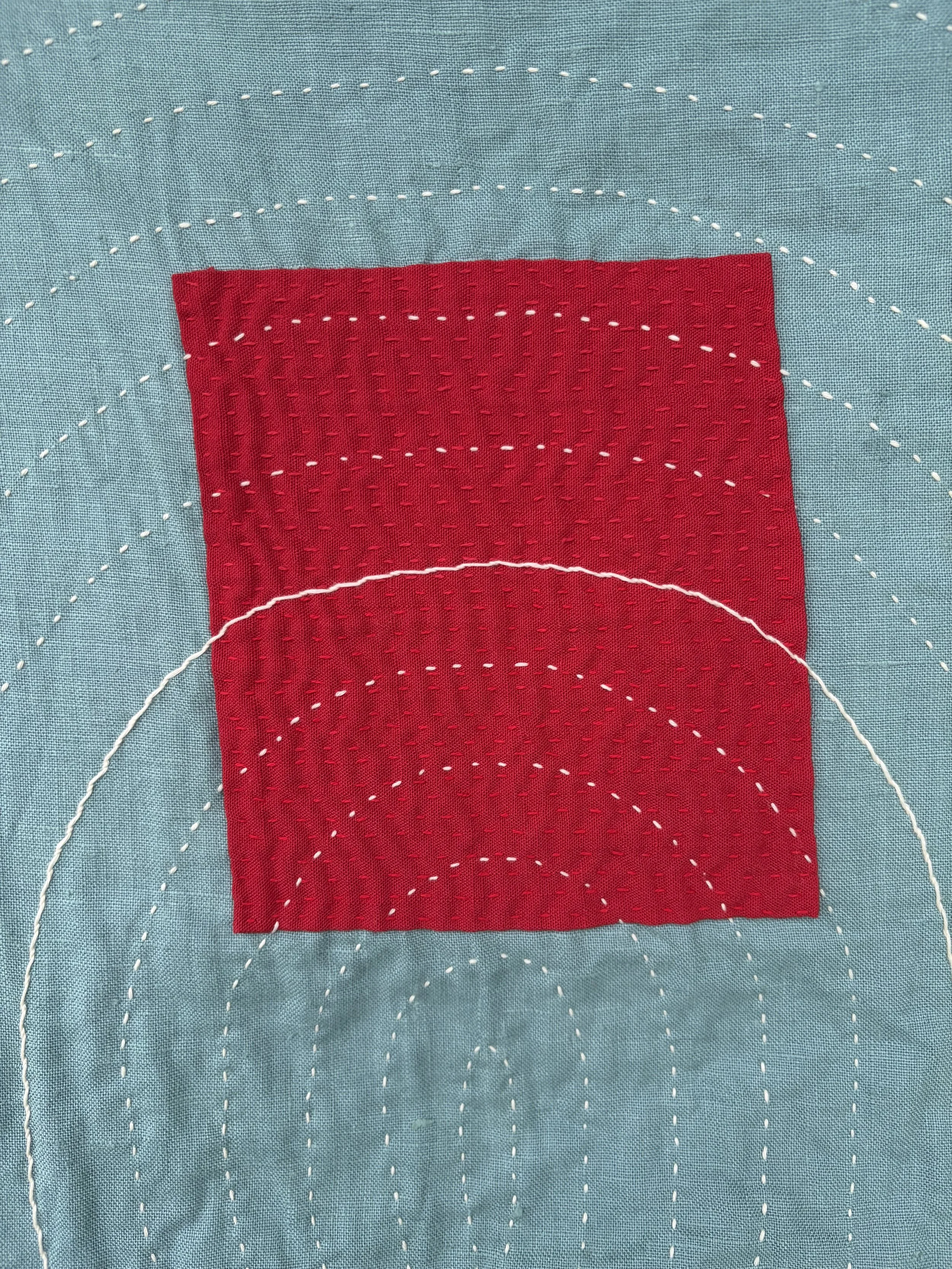 ", Hand-pieced and quilted with repurposed textiles, 45"x47", 2026
